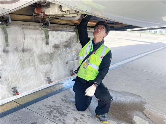 吳俊斌正在檢查一架客機(jī)的散熱器艙