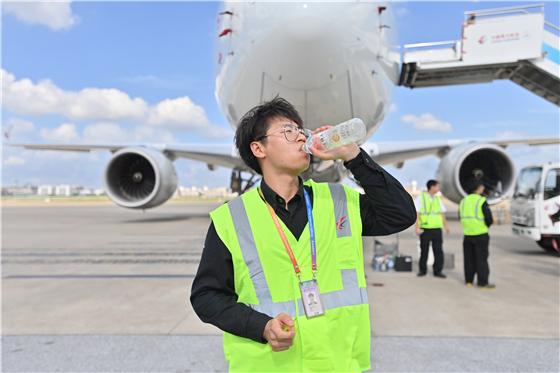 天氣炎熱,機(jī)務(wù)們喝水解渴