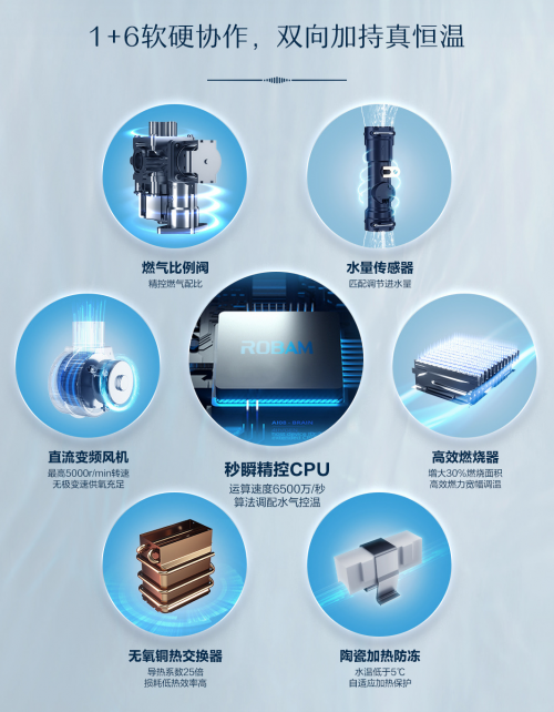 硬件上,【川】系列燃?xì)鉄崴鱄T730搭載秒瞬精控CPU,內(nèi)置全新升級的PID智能算法,可達(dá)6500萬/秒超速運(yùn)算,精準(zhǔn)計(jì)算水氣配比,使燃?xì)獗壤y和水量傳感器快速響應(yīng),迅捷精控持久恒溫。水流量傳感器,可精準(zhǔn)調(diào)節(jié)進(jìn)出口水量,在CPU的配合下實(shí)現(xiàn)水溫恒定;燃?xì)獗壤y,實(shí)時(shí)精控燃?xì)庥昧?#xff0c;高能效穩(wěn)定控溫;高效燃燒器,創(chuàng)新增氧V型火排,增大30%燃燒面積,增強(qiáng)89.68%燃燒效率,削弱15%運(yùn)行噪音,分段穩(wěn)然技術(shù)讓小火中火大火靈活調(diào)控,實(shí)現(xiàn)35-60℃寬幅調(diào)溫。直流變頻風(fēng)機(jī),最高5000r/min轉(zhuǎn)速無極變速高效供氧充足。高效無氧銅熱交換器,除了導(dǎo)熱性耐腐蝕性出色,還具備更強(qiáng)的熱沖擊性能。陶瓷加熱防凍,當(dāng)水溫低至5℃,四個(gè)陶瓷加熱器便會啟動加熱保護(hù),無懼國內(nèi)高寒天氣,-20℃也能安心熱浴。1+6的軟硬件協(xié)作,便可讓【川】系列燃?xì)鉄崴鱄T730輸出澎湃熱水,給予你舒適的沐浴體驗(yàn)與不間斷的溫暖關(guān)懷。