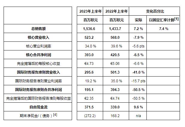 所有財(cái)務(wù)數(shù)據(jù)均以百萬歐元(€m)為單位。除非另有說明,本報告的業(yè)績涵蓋2023年6月30日之前的6個月期間(2023年上半年)和2023年6月30日之前的3個月期間(2023年第二季度),而進(jìn)行數(shù)據(jù)對比的對象為2022年6月30日之前的6個月期間(2022年上半年)和2022年6月30日之前的3個月期間(2022年第二季度)。除非另有說明,否則評論基于2023年上半年的業(yè)績。所有評論和較之前業(yè)績的比較均不包括2022年7月剝離的多元健康(CHC)業(yè)務(wù)的業(yè)績。