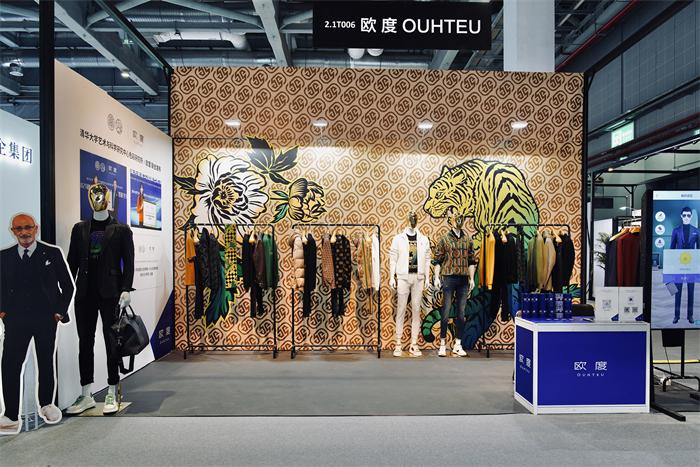 除了注重客戶體驗(yàn),現(xiàn)場(chǎng)服裝陳列搭配及展館搭建也很有講究。展廳內(nèi),第三代OT原創(chuàng)圖案與前Gucci設(shè)計(jì)師Paola Smania的“虎嗅薔薇”聯(lián)名印花,交相輝映,彰顯著歐度品牌的風(fēng)格與調(diào)性。墻面上老花、猛虎、花卉幾大元素渾然天成,帶來強(qiáng)烈的視覺藝術(shù)美感。左側(cè)墻面還展出了《歐度與清華大學(xué)藝術(shù)與科學(xué)研究中心色彩研究所》有關(guān)中國男裝色彩研究的合作報(bào)告。