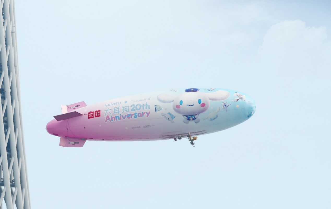在“大耳狗20周年”期間,名創(chuàng)優(yōu)品于3月19日當(dāng)天獨(dú)家打造了一架豪華飛艇,把“大耳狗寵上天”。這架飛艇圍繞廣州塔、海心橋、獵德大橋環(huán)繞飛行,從下往上看飛艇的外觀,正是大耳狗20周年慶主題海報。隨著飛艇乘風(fēng)而上,大耳狗仿佛躲進(jìn)輕紗包裹般的云端里,沖著地面的人打趣逗樂。