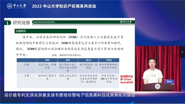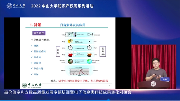 2022年4月28日,在中山大學(xué)的全程指導(dǎo)及越秀區(qū)政府的鼎力支持下,中山大學(xué)科學(xué)研究院、廣州高新區(qū)黃花崗科技園管委會、中山大學(xué)圖書館、廣州中大知識產(chǎn)權(quán)服務(wù)有限公司共同成功主辦中山大學(xué)知識產(chǎn)權(quán)周系列活動高價值專利支撐高質(zhì)量發(fā)展專題培訓(xùn)暨電子信息類科技成果轉(zhuǎn)化對接會。本次活動采取線上方式開展,邀請兩位業(yè)界專家圍繞高價值專利支撐高質(zhì)量發(fā)展做專題報(bào)告,多達(dá)178項(xiàng)電子信息類專利項(xiàng)目與83家企業(yè)進(jìn)行了精準(zhǔn)對接,活動在線人數(shù)超2.2萬人,多位知識產(chǎn)權(quán)專家及知名企業(yè)在云端匯聚,助力知識產(chǎn)權(quán)高質(zhì)量發(fā)展。