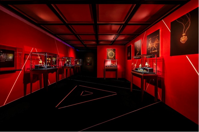 博大精深的中國傳統(tǒng)文化孕育出無限創(chuàng)造力和想象力,因此周大福珠寶集團在探索珠寶美學(xué)與中國傳統(tǒng)文化相結(jié)合的過程中不斷推陳出新,呈獻許多匠心獨運的藝術(shù)臻品——標(biāo)志性的周大福傳承系列作品。此次GOLD IS CHIC鎏光時代·周大福傳承系列黃金美學(xué)藝術(shù)展跨越時空界限,將蘊含歷史、文化的黃金美學(xué)呈現(xiàn)到大眾視野中,全方面展現(xiàn)黃金珠寶設(shè)計背后的時尚創(chuàng)意靈感、精益求精的工藝和具有東方韻味的藝術(shù)美學(xué)理念。此次展覽的空間設(shè)計從周大福傳承系列視覺大片中汲取靈感,衍生出紅黑金三色、光影不斷變換、又極富想象力的三個空間,以創(chuàng)新的藝術(shù)視角展現(xiàn)品牌具有中國傳統(tǒng)文化內(nèi)涵的時尚潮流形象。置身于展覽空間,映入眼簾的是霓虹線條與迷離燈光相互交織而成的“時光隧道”,使人仿佛置身于過去與未來的交界地。光影流動的變幻間,映照出品牌歷經(jīng)歲月沉淀后的璀璨輝煌,這意味著品牌正開啟黃金世代的嶄新篇章。