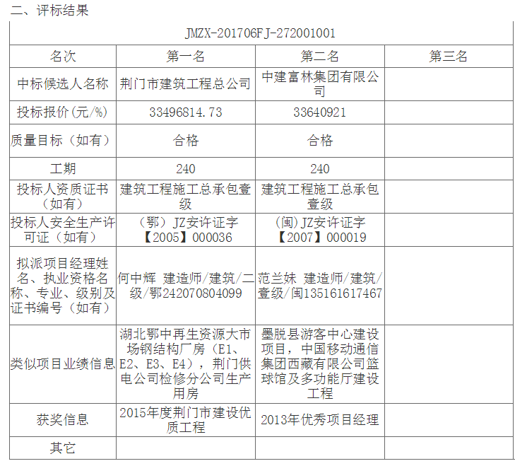 荊門(mén)市漳河新區(qū)譚店都市田園農(nóng)產(chǎn)品展示中心項(xiàng)目于2017.06.19.日在荊門(mén)市公共資源交易網(wǎng)發(fā)布招標(biāo)公告/發(fā)出投標(biāo)邀請(qǐng)書(shū),2017.08.18日在荊門(mén)市公共資源交易中心開(kāi)標(biāo),并于2017.08.18完成評(píng)標(biāo)工作。根據(jù)評(píng)標(biāo)委員會(huì)提交的評(píng)標(biāo)報(bào)告,荊門(mén)市漳河新區(qū)譚店都市田園農(nóng)產(chǎn)品展示中心項(xiàng)目已經(jīng)確認(rèn)評(píng)標(biāo)結(jié)果,現(xiàn)進(jìn)行評(píng)標(biāo)結(jié)果公示。
