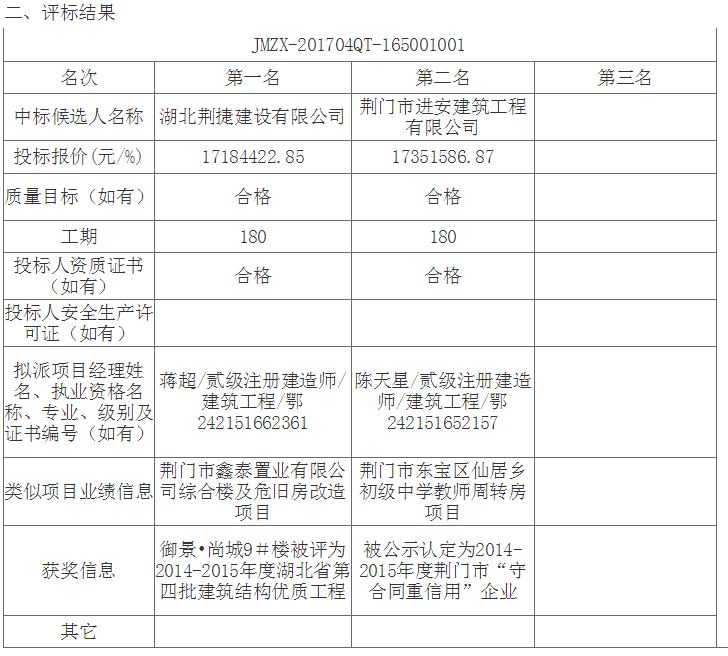 漳河鎮(zhèn)迎接社區(qū)安置房項(xiàng)目(公建及附屬工程)于2017.05.02.日在荊門市公共資源交易網(wǎng)發(fā)布招標(biāo)公告/發(fā)出投標(biāo)邀請(qǐng)書,2017.06.15日在荊門市公共資源交易中心開標(biāo),并于2017.06.15完成評(píng)標(biāo)工作。根據(jù)評(píng)標(biāo)委員會(huì)提交的評(píng)標(biāo)報(bào)告,漳河鎮(zhèn)迎接社區(qū)安置房項(xiàng)目(公建及附屬工程)已經(jīng)確認(rèn)評(píng)標(biāo)結(jié)果,現(xiàn)進(jìn)行評(píng)標(biāo)結(jié)果公示。