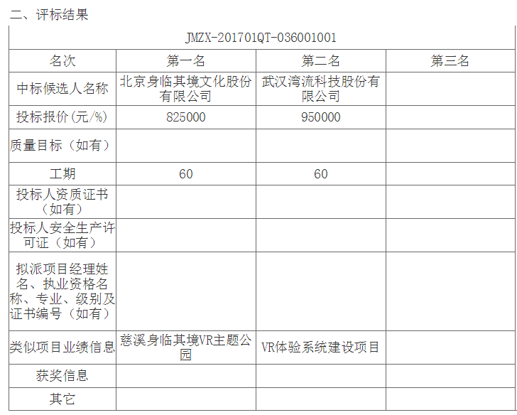 愛飛客文化展廳VR設(shè)施設(shè)備采購及安裝工程于2017.02.09.日在荊門市公共資源交易網(wǎng)發(fā)布招標(biāo)公告/發(fā)出投標(biāo)邀請(qǐng)書,2017.03.03日在荊門市公共資源交易中心開標(biāo),并于2017.03.03完成評(píng)標(biāo)工作。根據(jù)評(píng)標(biāo)委員會(huì)提交的評(píng)標(biāo)報(bào)告,愛飛客文化展廳VR設(shè)施設(shè)備采購及安裝工程已經(jīng)確認(rèn)評(píng)標(biāo)結(jié)果,現(xiàn)進(jìn)行評(píng)標(biāo)結(jié)果公示。