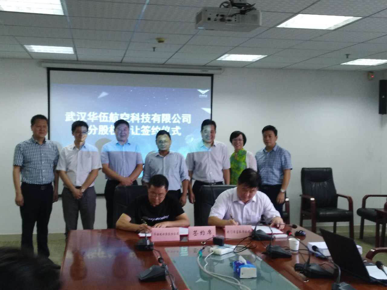 2017年9月12日,漳富公司與武漢華伍航空科技有限公司成功簽訂股權(quán)轉(zhuǎn)讓協(xié)議,漳富公司將持有武漢華伍航空科技有限公司25%的股權(quán)。荊門(mén)市人民政府黨組成員湯旺林、漳河新區(qū)黨委書(shū)記陳保寧、漳河新區(qū)人大聯(lián)絡(luò)組組長(zhǎng)高東杰、漳富公司董事長(zhǎng)李紅軍參加了簽約儀式。