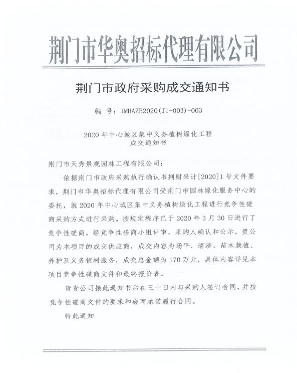 天秀園林公司圍繞著抗疫情、保生產、穩(wěn)經營,在參與疫情防控工作的同時在積極關注市場訊息,開拓新業(yè)務。公司于3月30日參加2020年中心城區(qū)集中義務植樹綠化工程競爭性磋商,成功中標,迎來2020年開門紅。