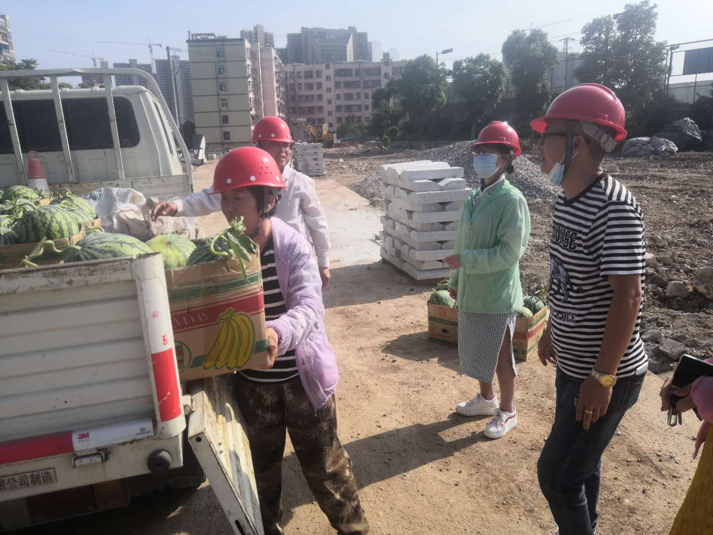 “你們辛苦了”,陳明輝同志將一箱箱雙井西瓜發(fā)放給現(xiàn)場(chǎng)工人并一一握手言謝。近日我市迎來(lái)持續(xù)高溫天氣,6月1日下午,漳富公司黨委委員、天秀園林公司總經(jīng)理陳明輝一行深入尉遲恭游園項(xiàng)目施工現(xiàn)場(chǎng),慰問(wèn)高溫下奮戰(zhàn)的一線職工。