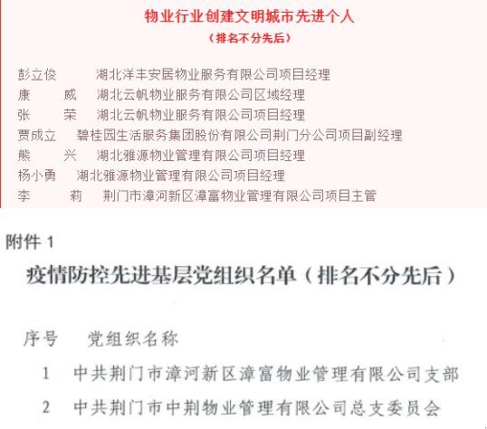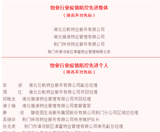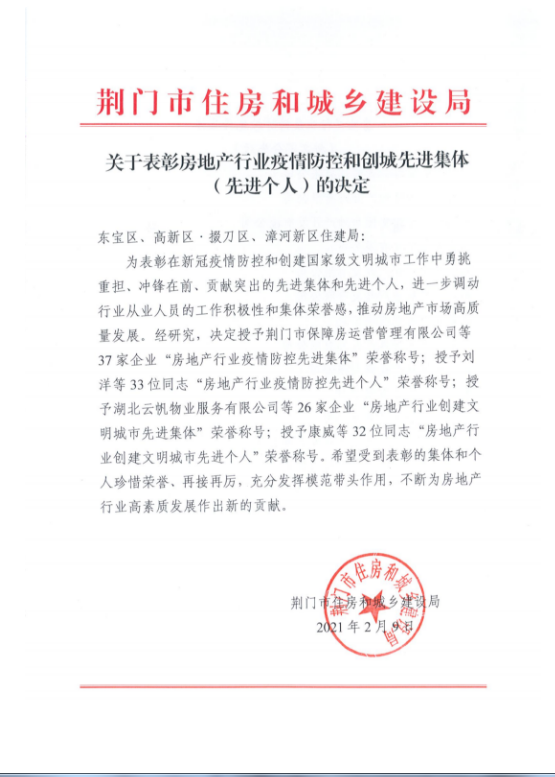 近日,漳富物業(yè)公司被荊門市住房和城鄉(xiāng)建設局授予“物業(yè)行業(yè)疫情防控先進集體”榮譽稱號,被中共荊門市物業(yè)服務和管理協(xié)會授予“疫情防控先進基層黨組織”榮譽稱號,被湖北省、荊門市物業(yè)服務和管理協(xié)會授予“抗擊疫情優(yōu)秀企業(yè)”“抗擊疫情先進集體”稱號。孫龍虎同志榮獲“物業(yè)行業(yè)疫情防控先進個人,馮勇、馬利同志榮獲“物業(yè)行業(yè)抗擊疫情先進個人”,李莉同志榮獲物業(yè)行業(yè)“創(chuàng)建文明城市先進個人”和“疫情防控先進共產(chǎn)黨員”。