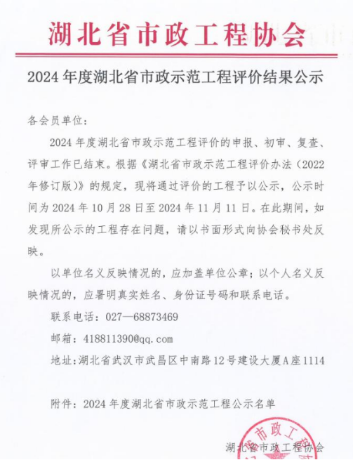 龍年將盡,再添佳績。近日,湖北省市政工程協(xié)會公示了2024年度“湖北省市政示范工程”評價結(jié)果,由漳富集團(tuán)投資、天鼎市政公司承建的荊門市漳河新區(qū)譚店新社區(qū)道路、給水、排水及配套工程EPC總承包項目榮獲2024年度“湖北省市政項目示范工程”稱號。